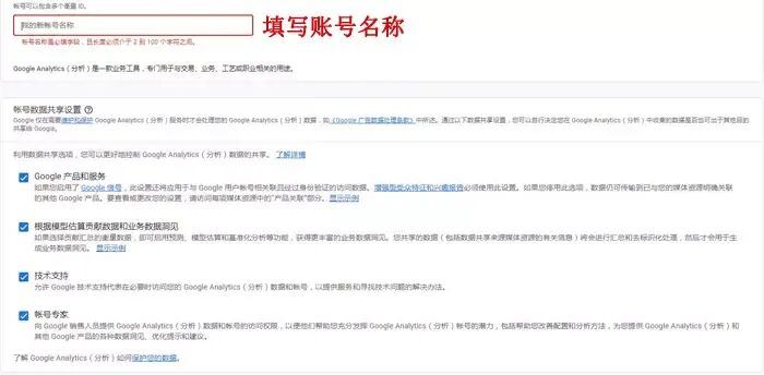 步骤二:登录谷歌账号,打开谷歌分析页面:analytics.google.com,点击开始衡量,进入创建账号页面:填写账号名称,下边默认全选,然后点击下一步。