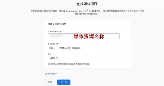 步骤三:创建媒体资源。媒体资源不仅包括网站,也包括一些应用等。填写媒体资源名称,设置时区以及币种。