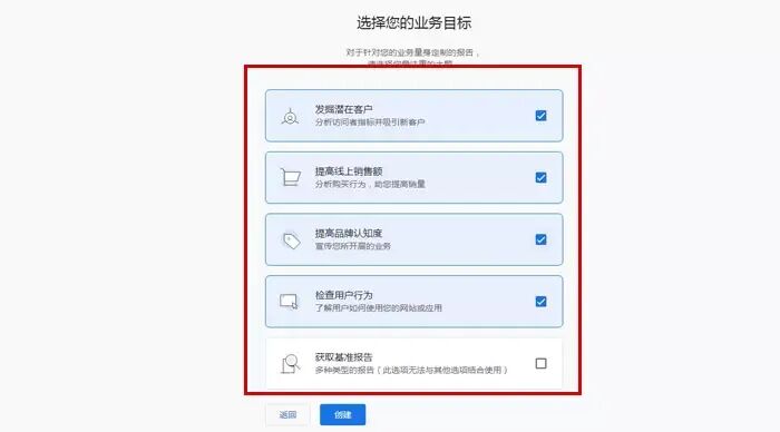 步骤五:选择业务目标,即通过谷歌分析我可以达到什么样的目的,根据我们的自身需要选择,可以多选。