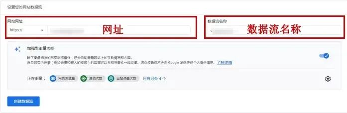 ② 设置数据流,即数据从我们的网站或者应用的流向,比我们某个网站的访客数据流向,这里我们要填写我们的具体网站地址,以及数据流名称。其它选项默认,然后点击创建数据流。