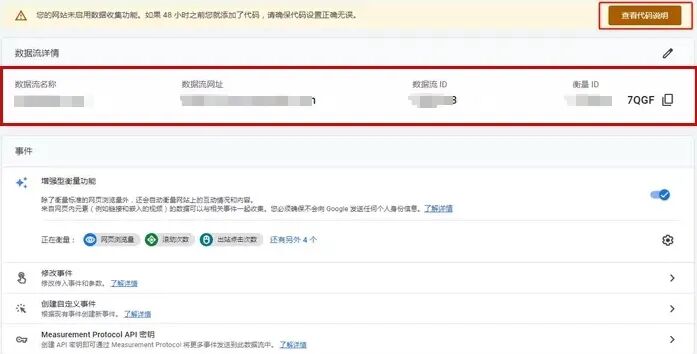 ③ 添加代码,只有在网站添加代码之后,谷歌工具才能成功从网站收集数据。所以这一步非常重要。我们接着上一步,点击创建数据流之后来到新的页面,然后点击查看代码说明。