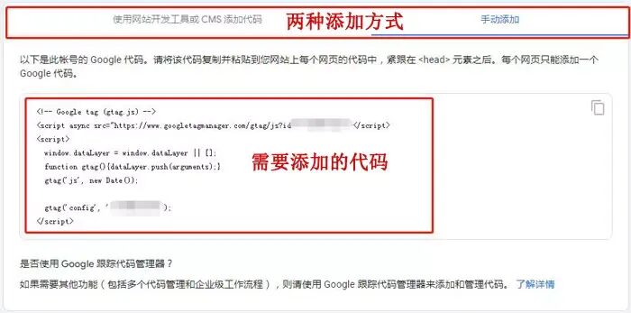 之后我们看到有代码安装说明,这里提供两种安装方式:使用网站开发工具或者CMS添加代码,比如我做的网站用的是Wordpress,我可以直接用插件进行安装;第二种是手动添加,手动添加会自动生成一段代码,我们只需要把这段代码添加到每个要统计的数据的页面的头部(紧跟在 元素标签之后)即可。