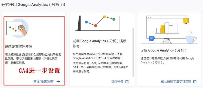 代码安装之后,谷歌工具就开始收集我们的网站数据,代码生效速度非常快,一般当时添加之后就能立刻看到相应的数据。同时我们也可以点击谷歌分析首页下方的Google Analytics(分析)4设置助力,进行更为具体设置。