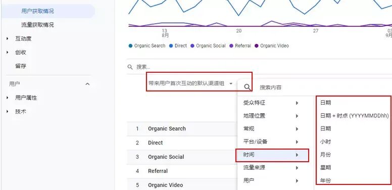 找到对应的数据报表-“带来用户首次互动的默认渠道组”右侧又一个“+”点击-选择时间-选择具体的时间类型即可。