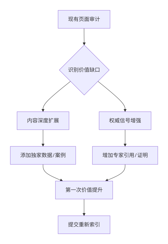 内容价值分数 = 信息独特性 × 0.3 + 覆盖完整性 × 0.25 + 组织结构 × 0.2 + 可操作性 × 0.15 + 时效性 × 0.1