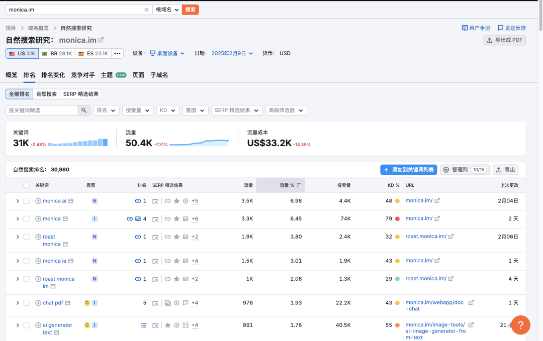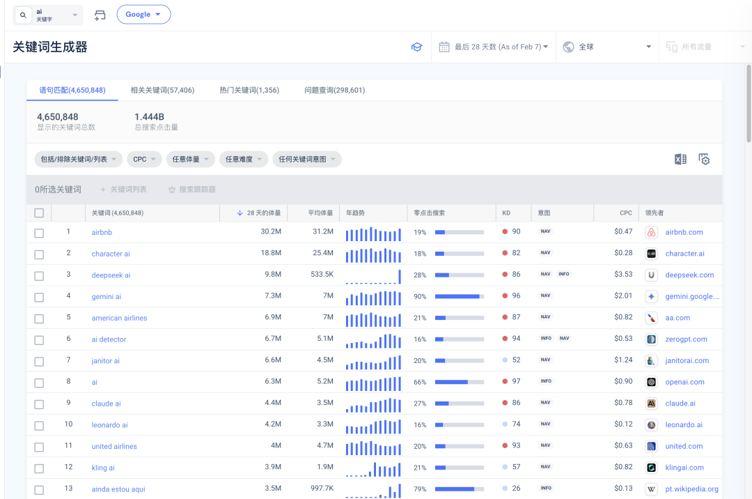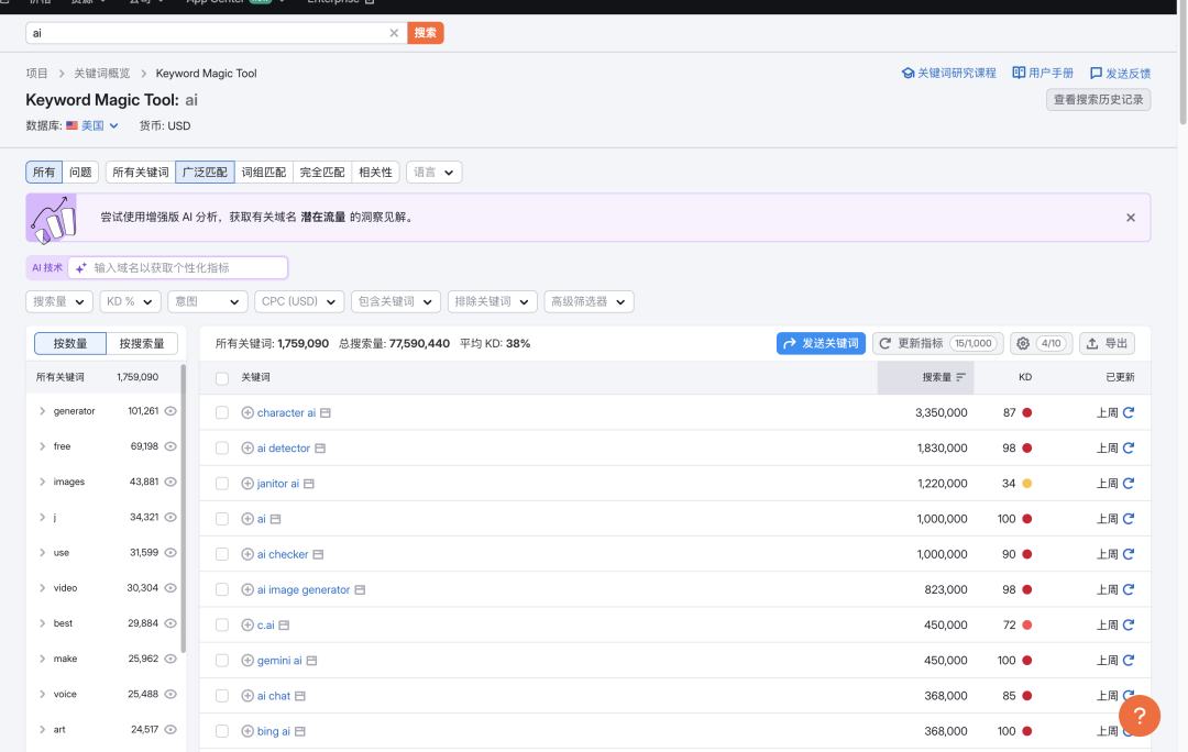 在keyword magic tool中放入一个词根,在结果中找到一个你喜欢的词,放入google 搜索一遍,找到别的网站,你好奇他是干嘛的,再把这个网站放回semrush中看这个网站关键词有哪些,再找到新的关键词放入google 搜索